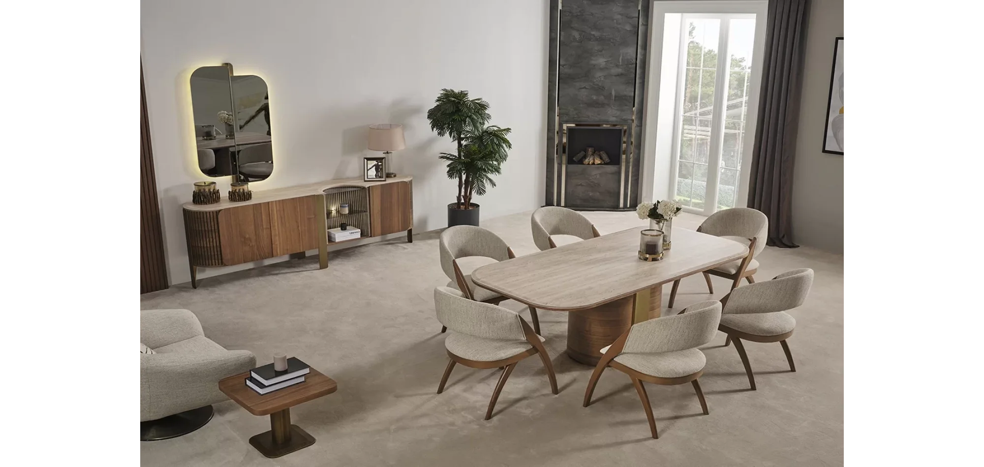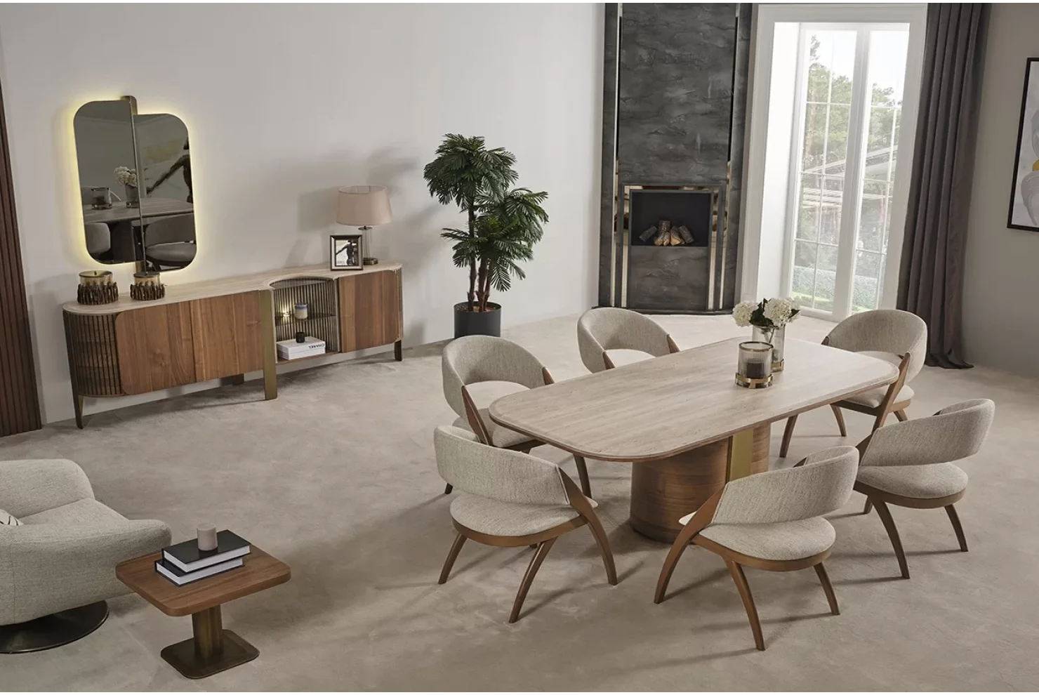 Adora Yemek Odası Takımı, modern detayları ve zarif çizgileriyle yaşam alanınıza sofistike bir hava katıyor. LED aydınlatmalı aynası, ortadan ayaklı sabit masa tasarımı ve konforlu sandalyeleriyle hem işlevsel hem estetik bir deneyim sunar. Adora, çağdaş stil ve kullanışlılığı bir araya getirir.