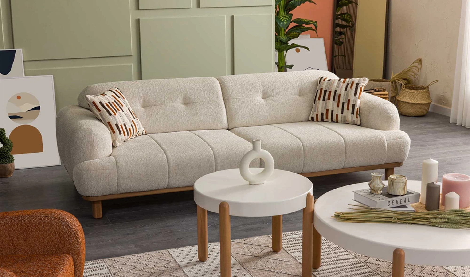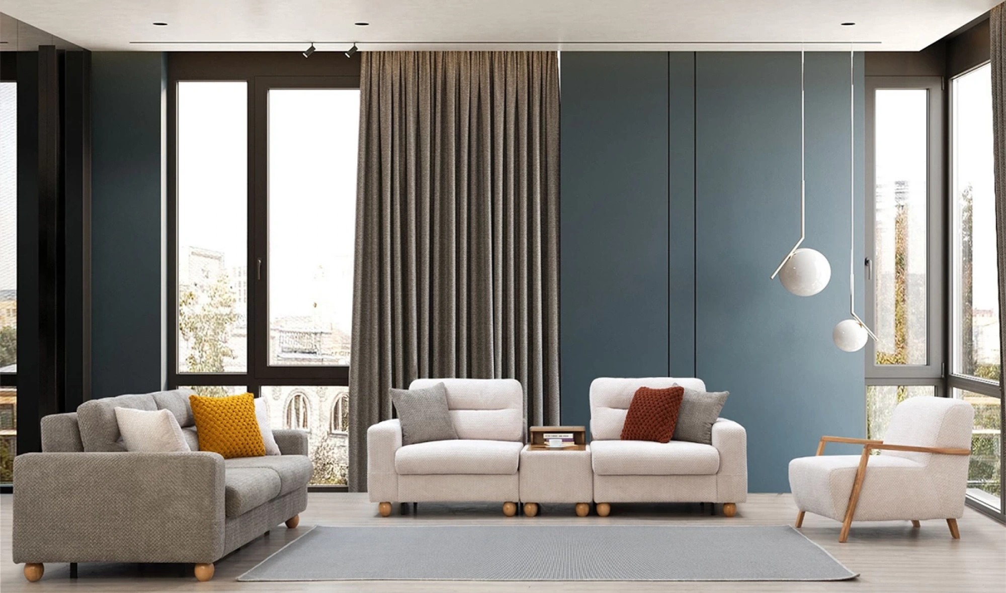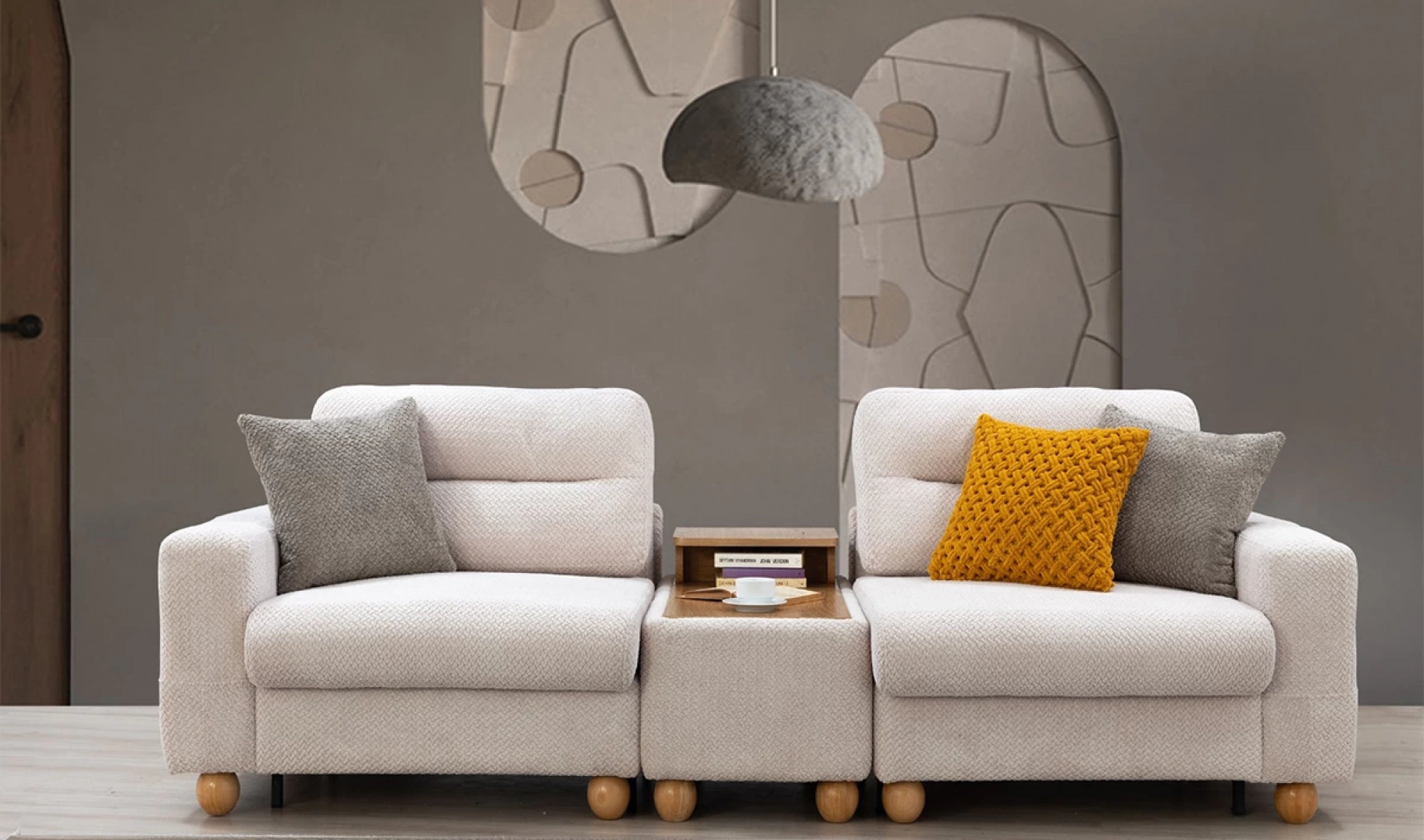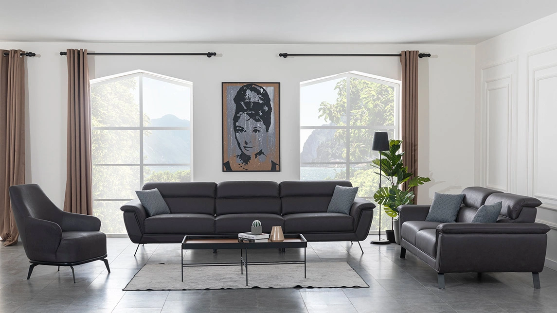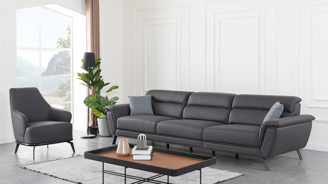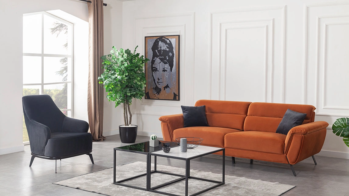 Cesi Koltuk Takımı, modern yaşam alanlarına konfor, zarafet ve fonksiyonelliği bir arada sunmak üzere tasarlandı. Kadife ve nubuk kumaş kombinasyonu, hem yumuşak dokusu hem de dayanıklılığıyla dikkat çeker. Gri, antrasit ve turuncu tonlarının uyumu, ortama sofistike bir karakter kazandırır. Yerden yüksek metal ayak tasarımı sayesinde temizlik kolaylığı sağlarken, sırt mekanizması ve yatak olma özelliği pratik kullanım avantajı sunar.