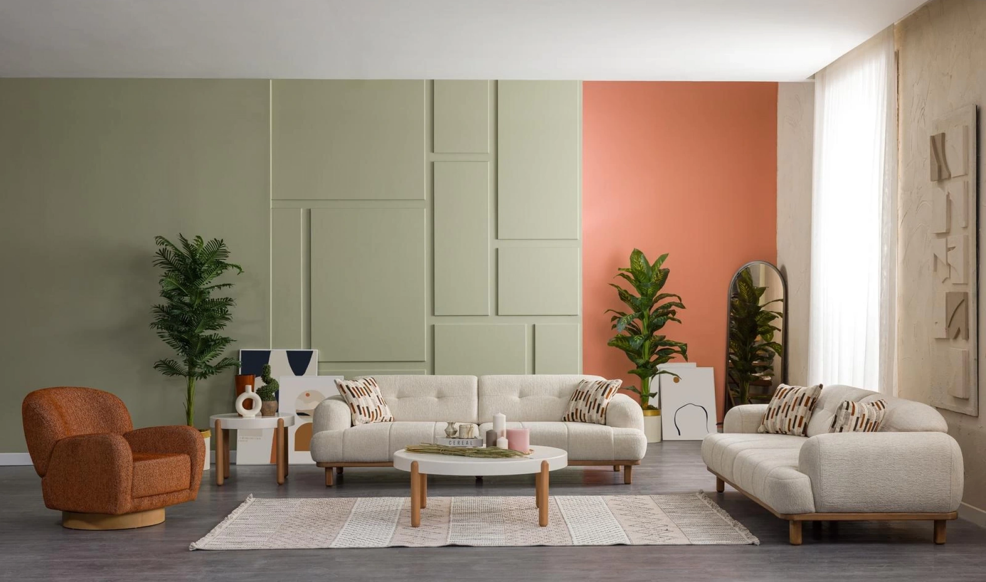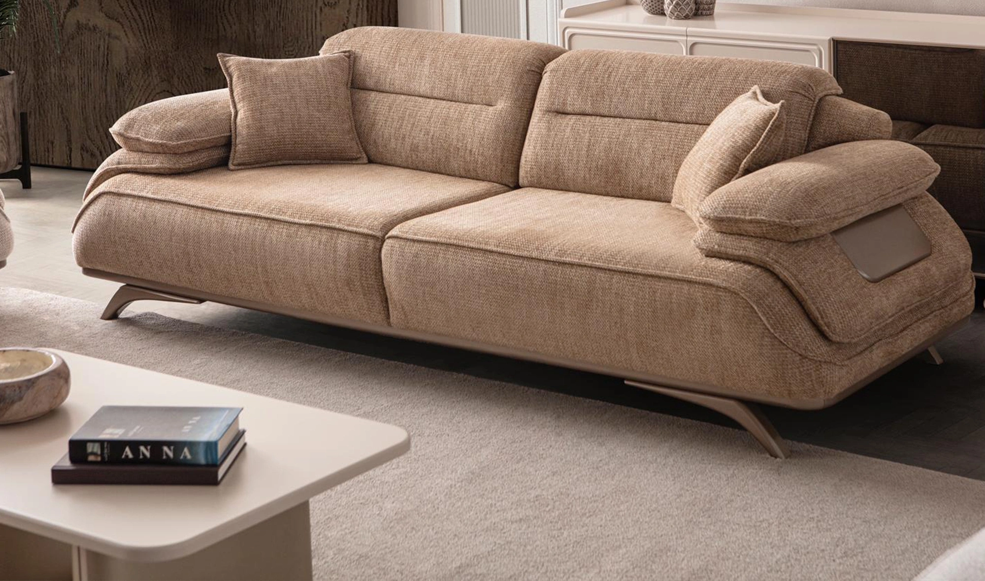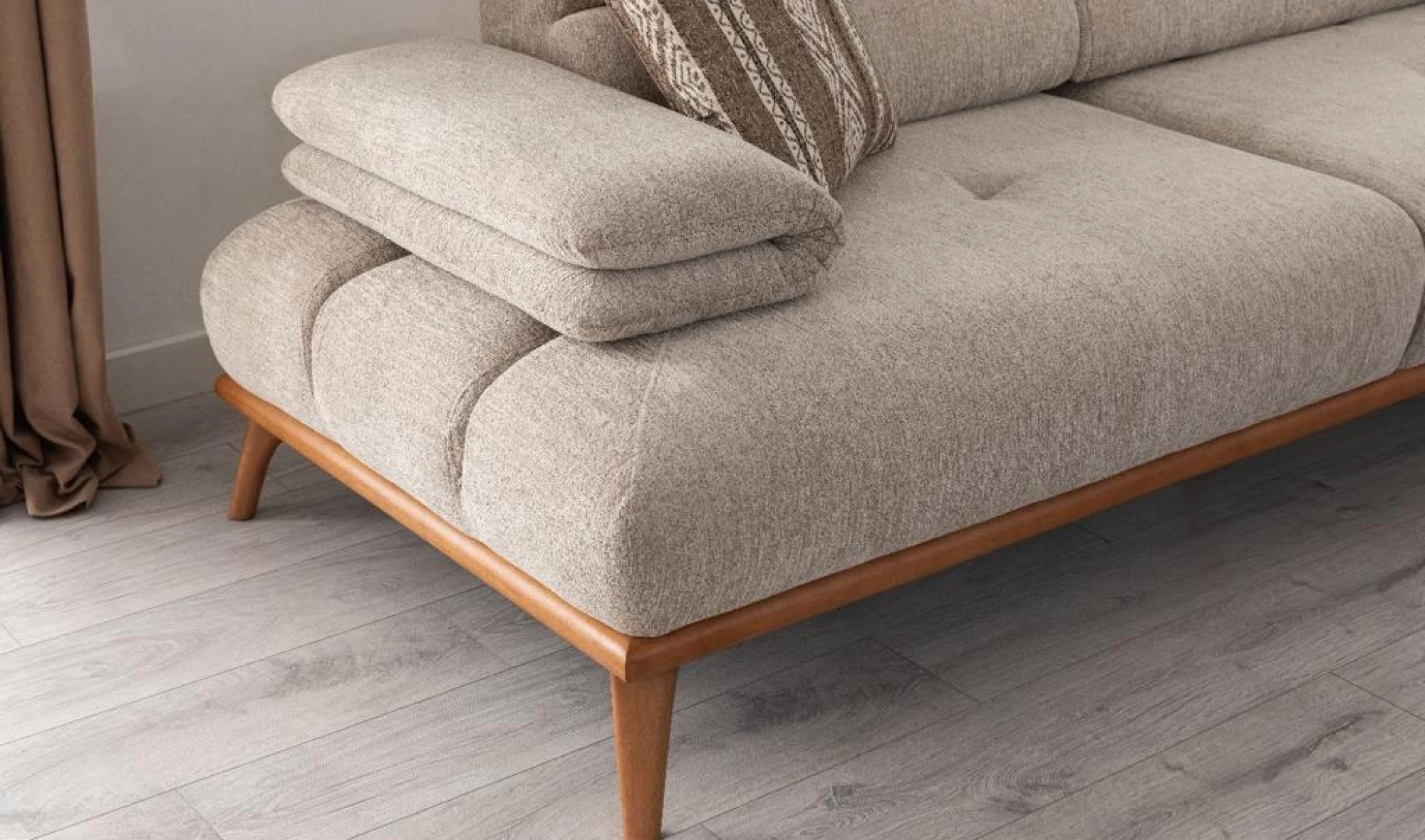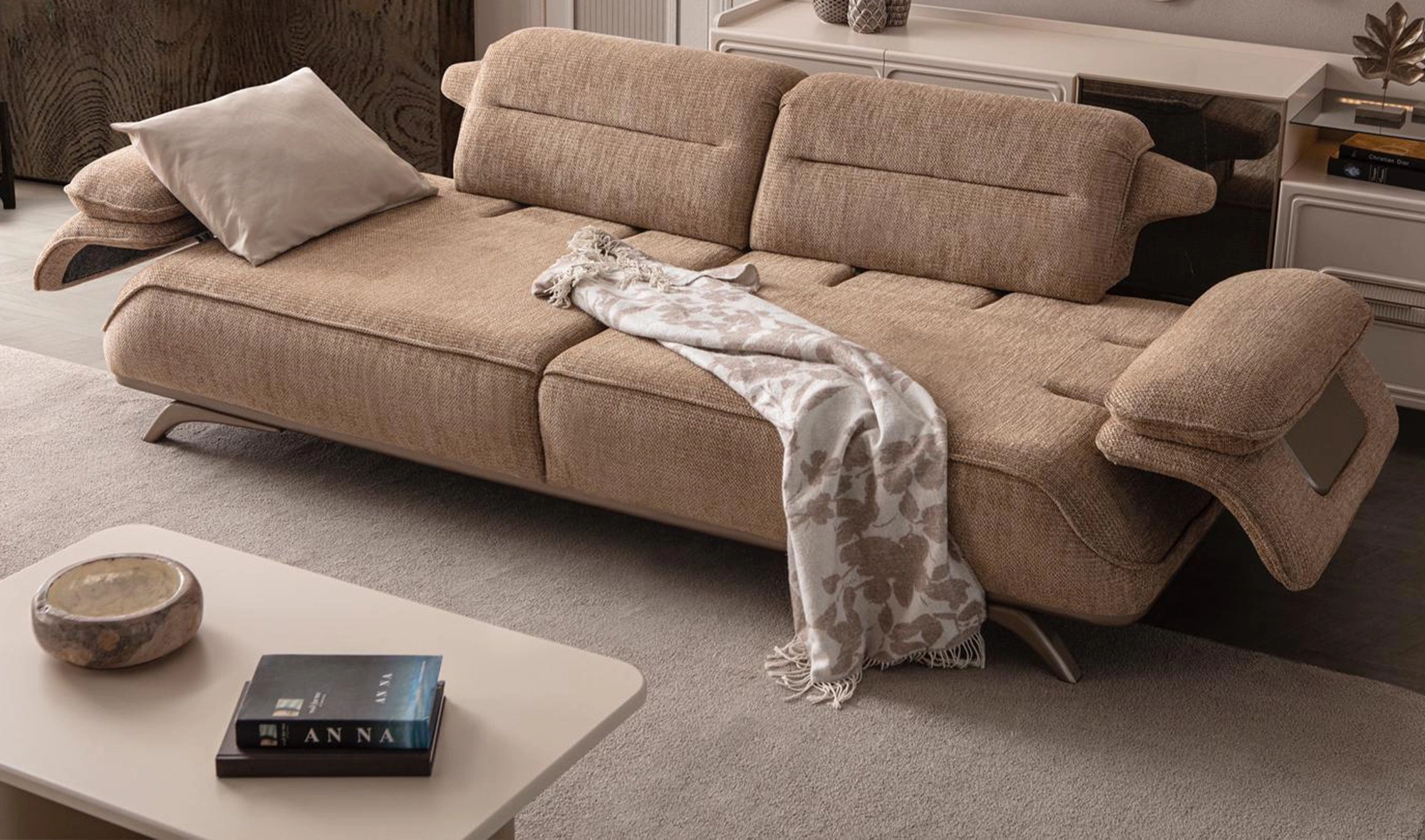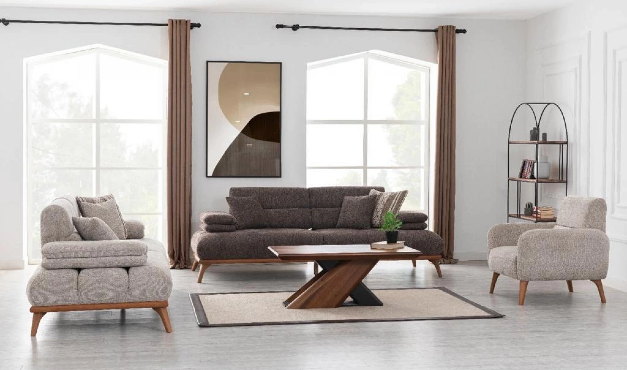 Cesi Koltuk Takımı, modern yaşam alanlarına konfor, zarafet ve fonksiyonelliği bir arada sunmak üzere tasarlandı. Kadife ve nubuk kumaş kombinasyonu, hem yumuşak dokusu hem de dayanıklılığıyla dikkat çeker. Gri, antrasit ve turuncu tonlarının uyumu, ortama sofistike bir karakter kazandırır. Yerden yüksek metal ayak tasarımı sayesinde temizlik kolaylığı sağlarken, sırt mekanizması ve yatak olma özelliği pratik kullanım avantajı sunar.