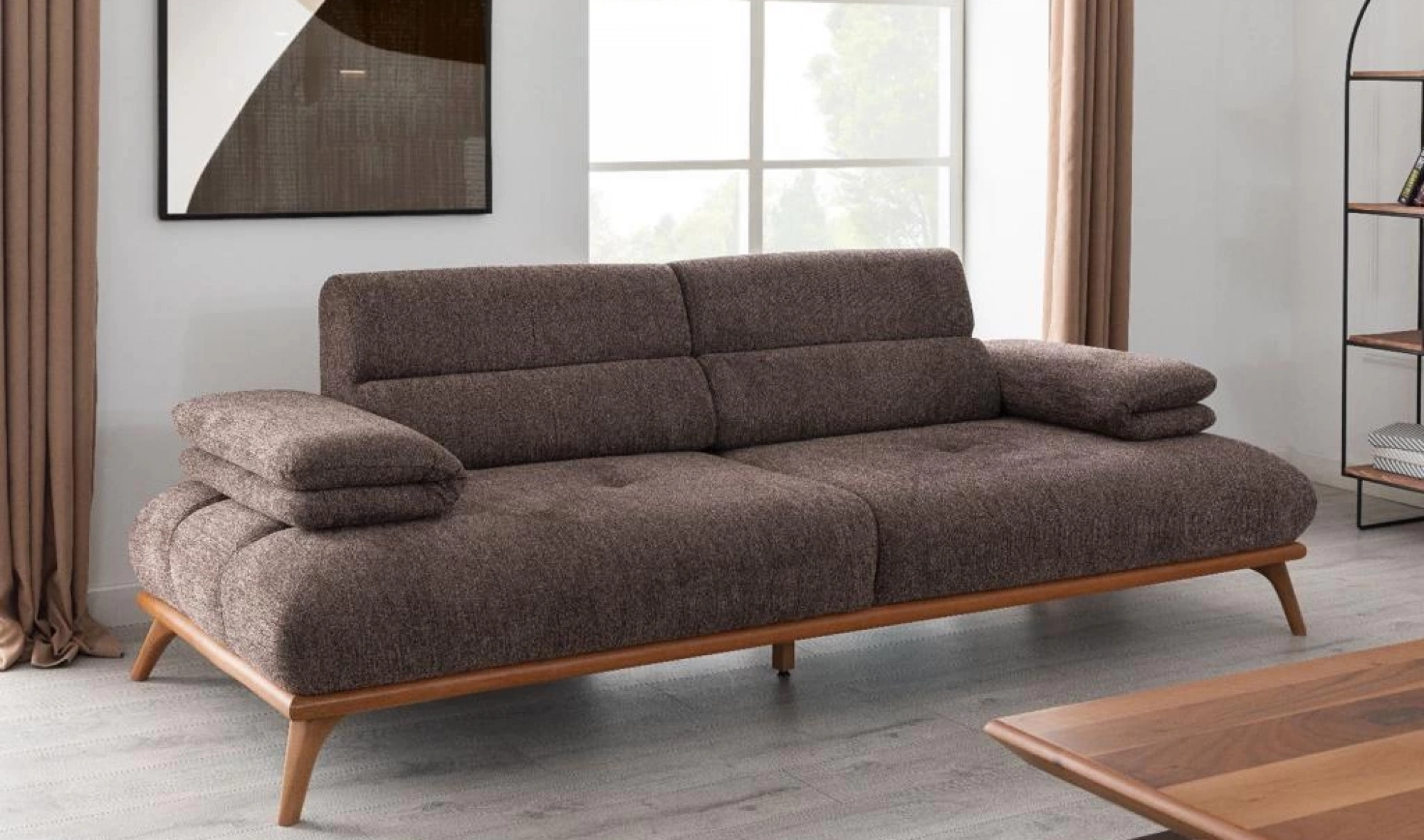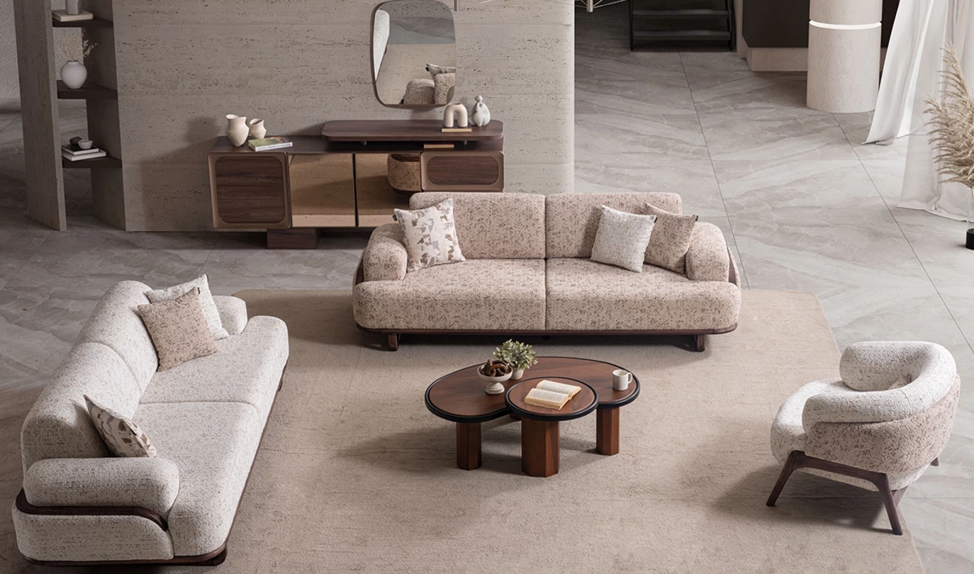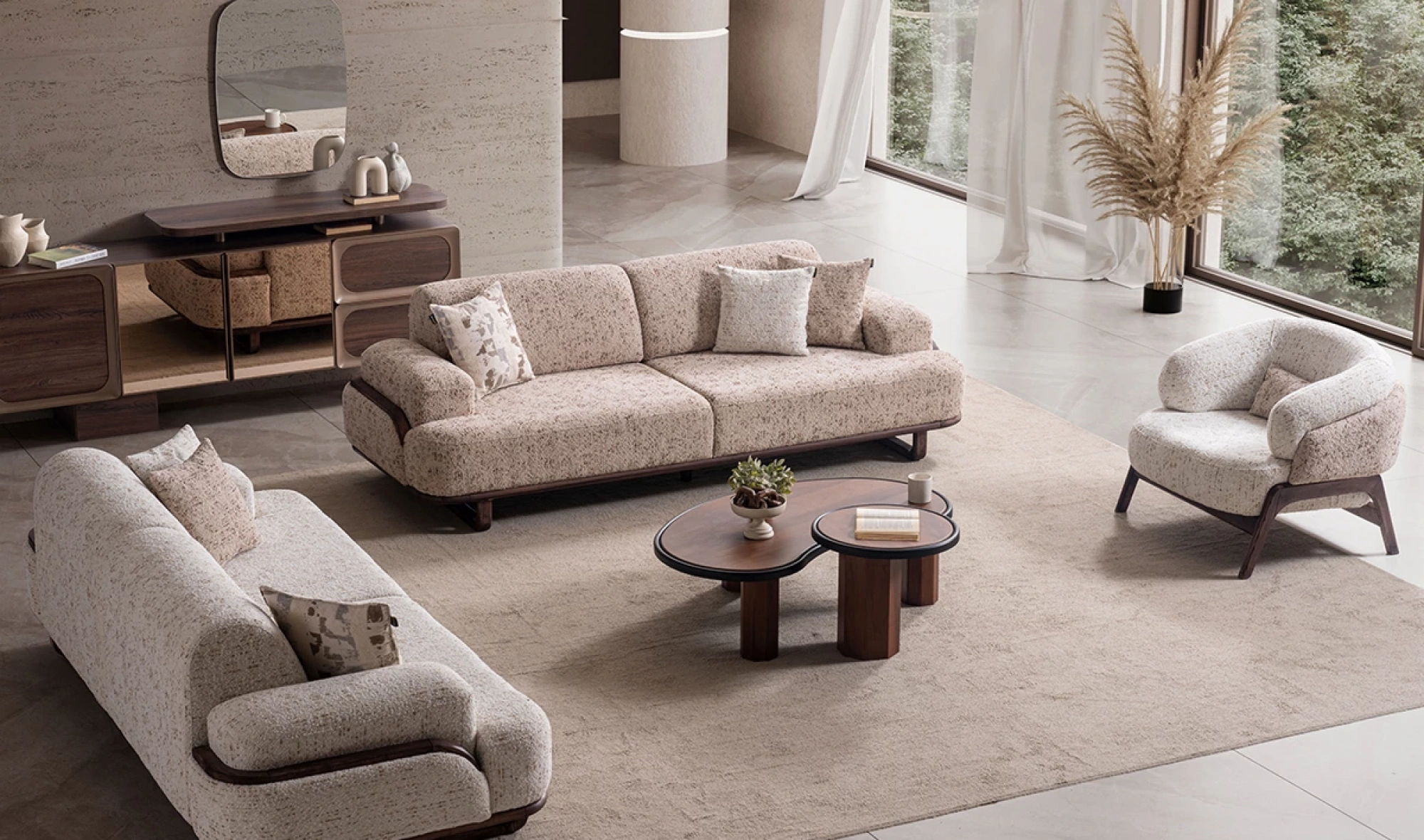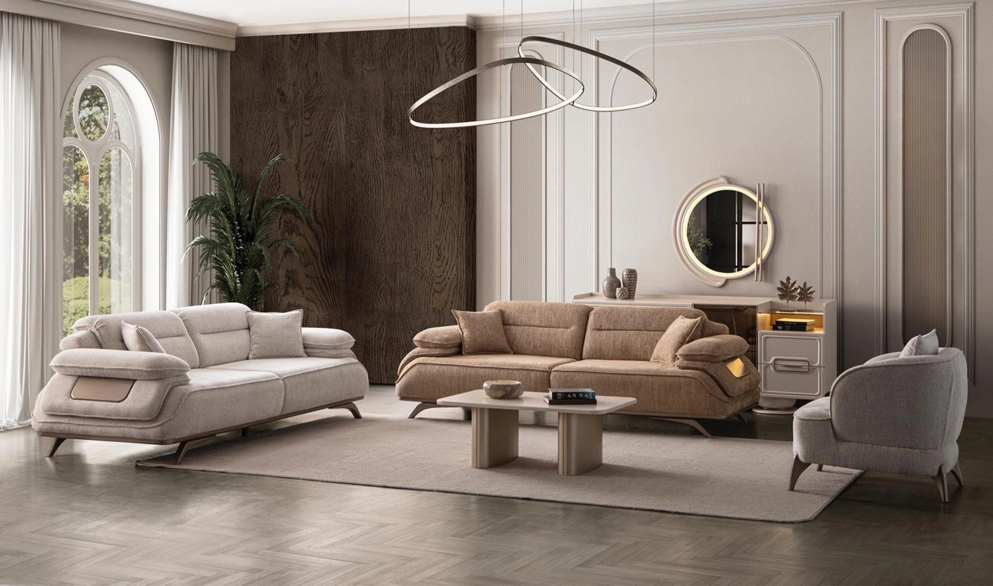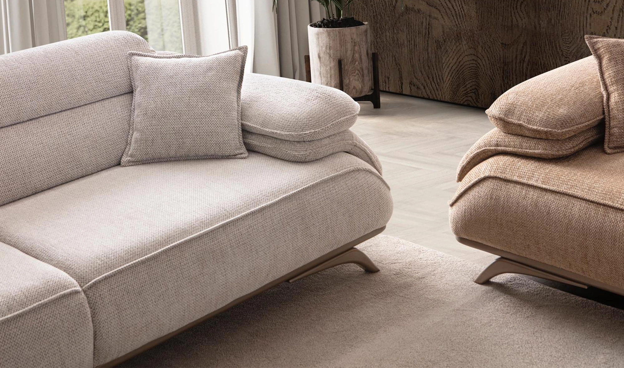 Cesi Koltuk Takımı, modern yaşam alanlarına konfor, zarafet ve fonksiyonelliği bir arada sunmak üzere tasarlandı. Kadife ve nubuk kumaş kombinasyonu, hem yumuşak dokusu hem de dayanıklılığıyla dikkat çeker. Gri, antrasit ve turuncu tonlarının uyumu, ortama sofistike bir karakter kazandırır. Yerden yüksek metal ayak tasarımı sayesinde temizlik kolaylığı sağlarken, sırt mekanizması ve yatak olma özelliği pratik kullanım avantajı sunar.