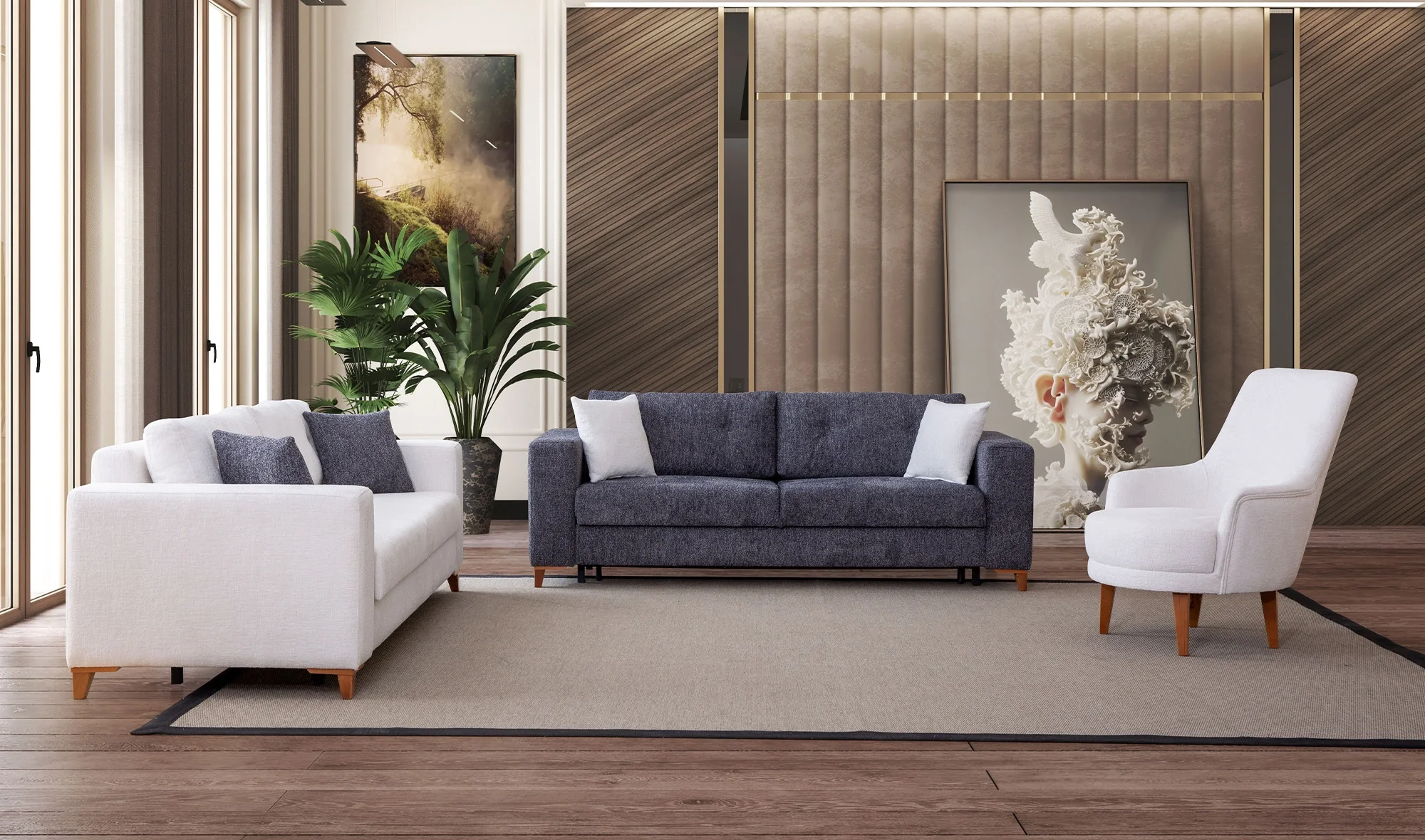 Evora Koltuk Takımı, sadece şık bir oturma grubu değil aynı zamanda pratik bir yaşam çözümüdür. Çift kişilik yatak olabilen yapısı sayesinde misafirleriniz için ekstra konfor sunarken, kaliteli malzeme yapısı ile uzun yıllar güvenle kullanılabilir. Modern tasarımı ile her dekorasyona uyum sağlar.