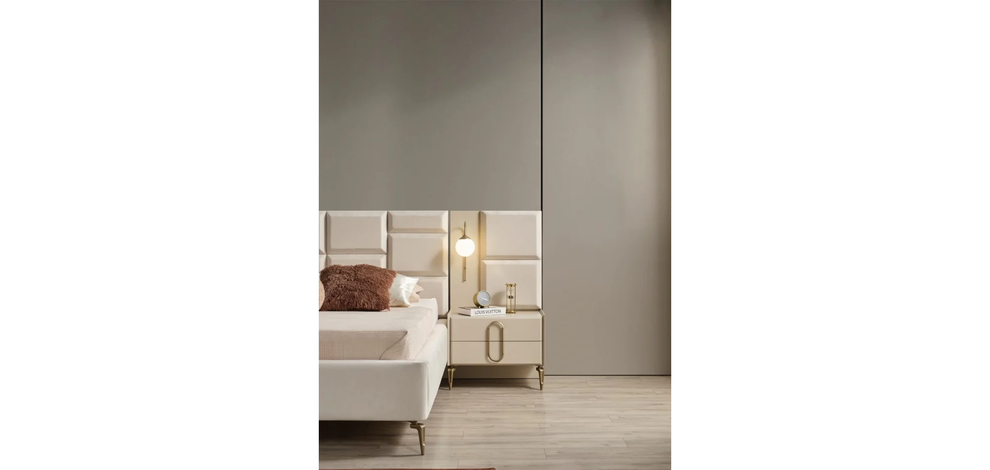 Flare Yatak Odası Takımı, modern tasarımı ve fonksiyonel detaylarıyla yatak odanıza zarafet katıyor. Kumtaşı rengin doğal tonları, bronz kulp ve ayak detaylarıyla birleşerek sofistike bir görünüm sunar. 6 kapılı geniş gardırop, kıyafetlerinizi düzenli saklamanız için ideal depolama alanı sağlar. Aydınlatmalı başlık, hem estetik hem de işlevsel bir dokunuş sunarken, geniş şifonyer ve panolu komodinler yaşam alanınıza düzen ve şıklık kazandırır. Yüksek kaliteli malzeme yapısı sayesinde uzun yıllar formunu korur.