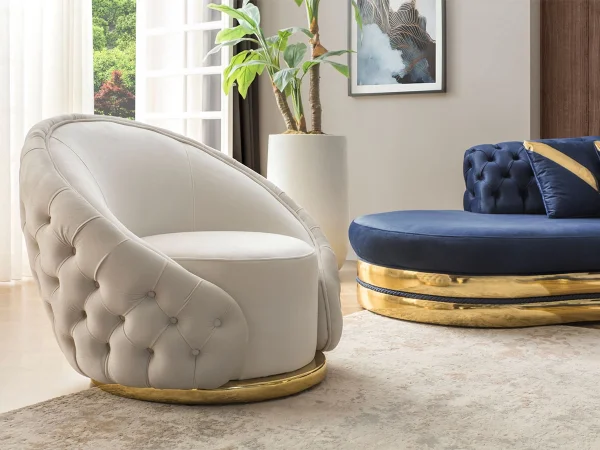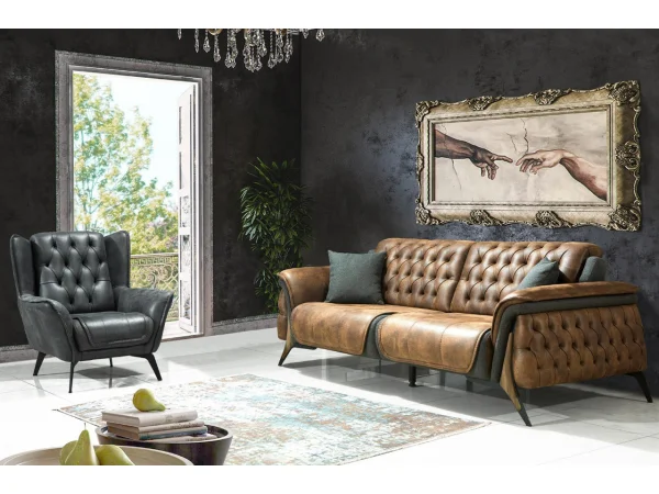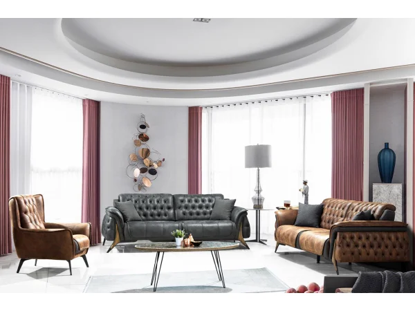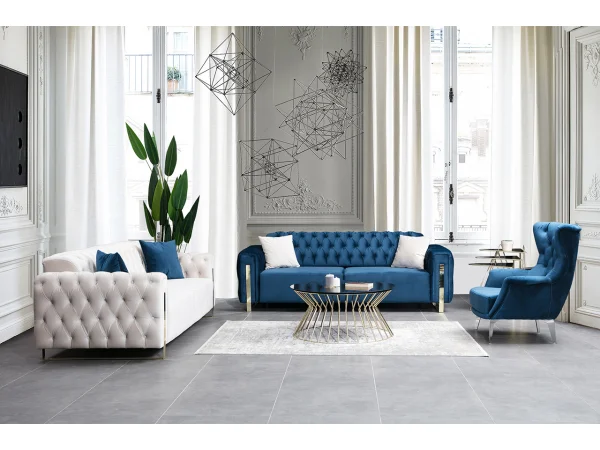 Chester Koltuk Takımları, kapitone detayları ve derin düğme uygulamalarıyla göz dolduruyor. Masif ahşap ayaklar ve el işçiliğiyle şekillenen detaylar, her bir parçayı adeta bir sanat eserine dönüştürüyor.