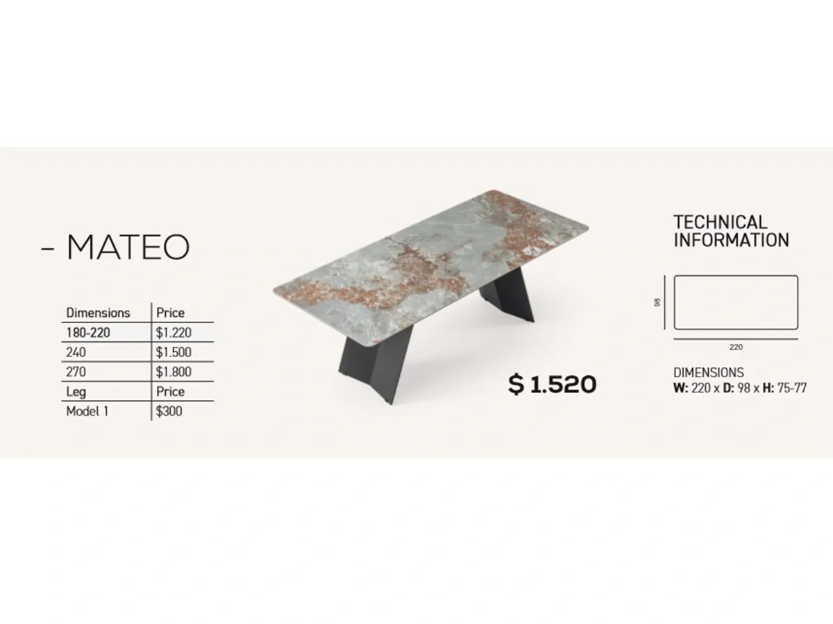 Mateo Seramik Masa, modern çizgileriyle zamansız bir şıklık sunarken İtalyan üretimi dayanıklı seramik yüzeyi sayesinde uzun ömürlü kullanım sağlar. Doğal taş dokusunun estetik detayları, modern kesim hatlarıyla birleşerek hem ev hem iş alanlarında sofistike bir görünüm yaratır. Çizilmelere, ısıya ve güneş ışığına karşı üstün performansı ile Mateo, premium masa deneyimi arayanlar için mükemmel bir seçimdir.