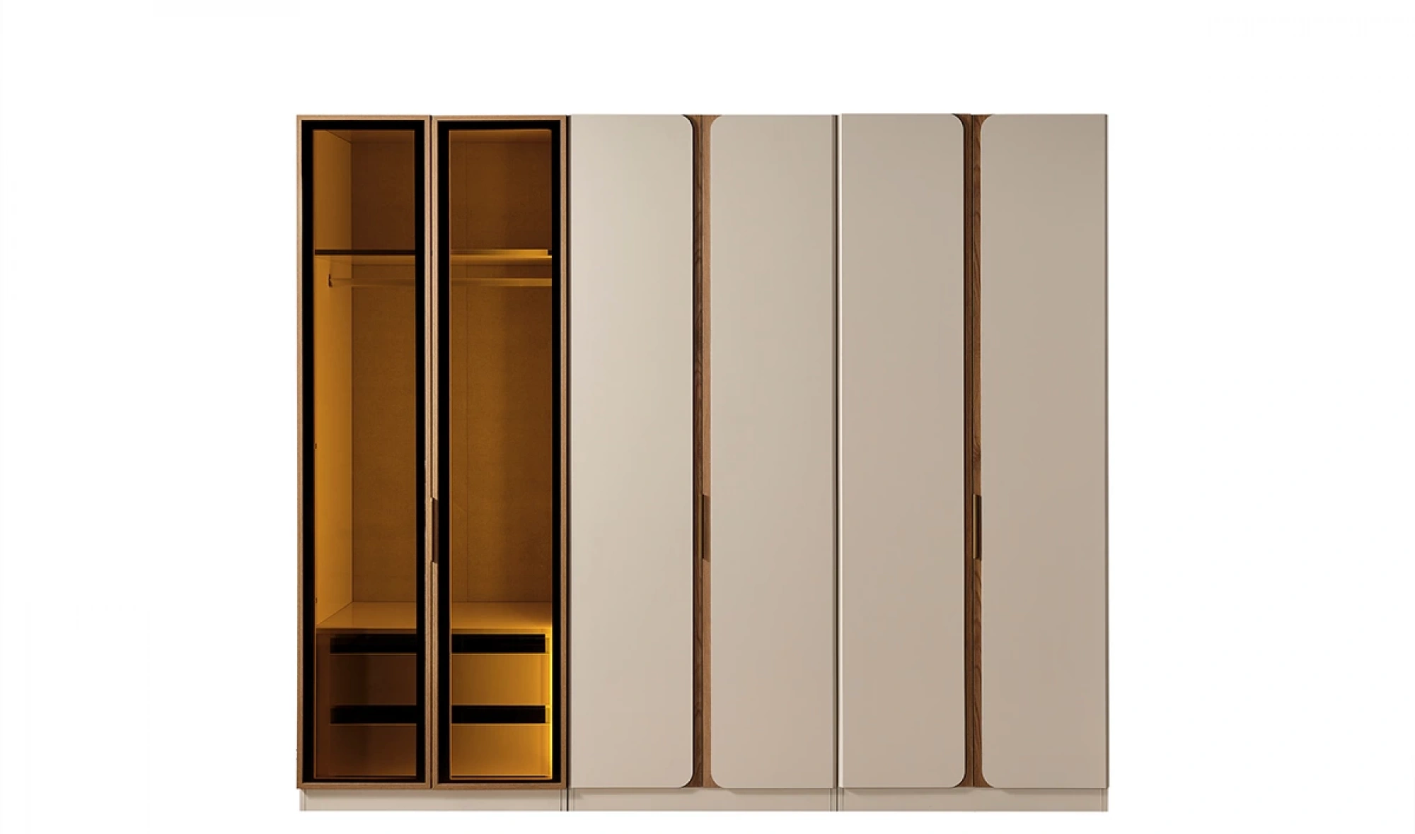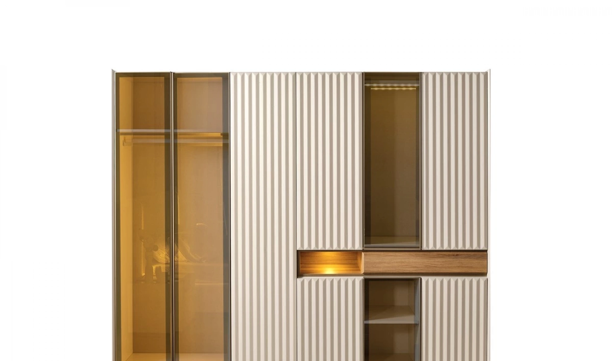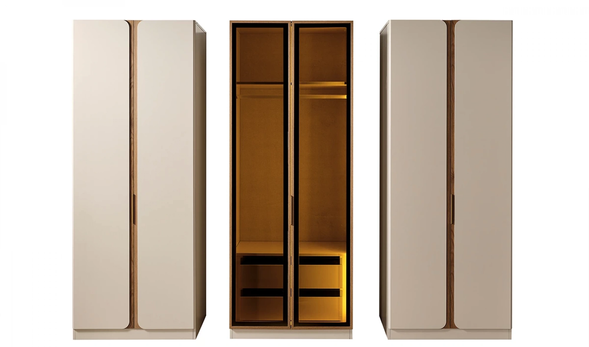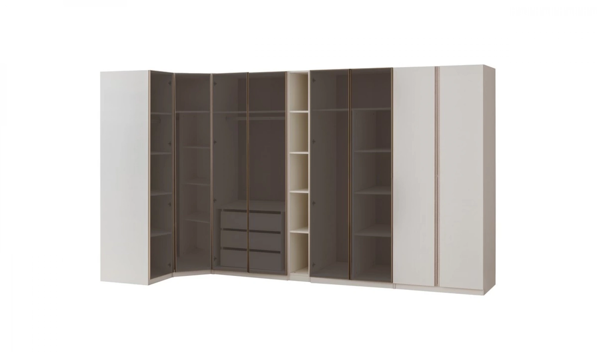 Modüler yapıya sahip dolap tasarımı, 1+4+1 kapak düzeni ile birlikte kullanıcıya özel kombinasyon imkanı sağlıyor. Geniş raf alanları, askılıklar ve çekmeceler; ceket, gömlek, elbise ve tüm kıyafet gruplarınızı kolayca yerleştirmenize olanak tanır. Özellikle köşe modül seçeneği ile giyinme odası olarak kullanılabilir nitelikte bir çözümdür.