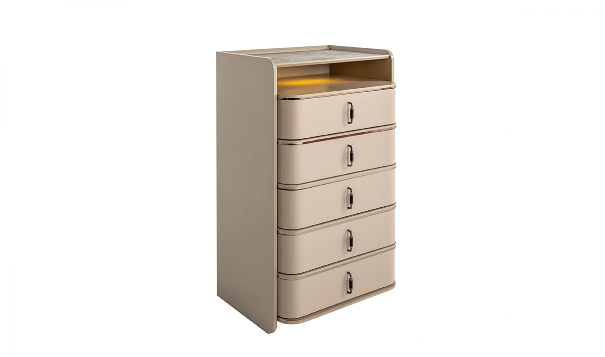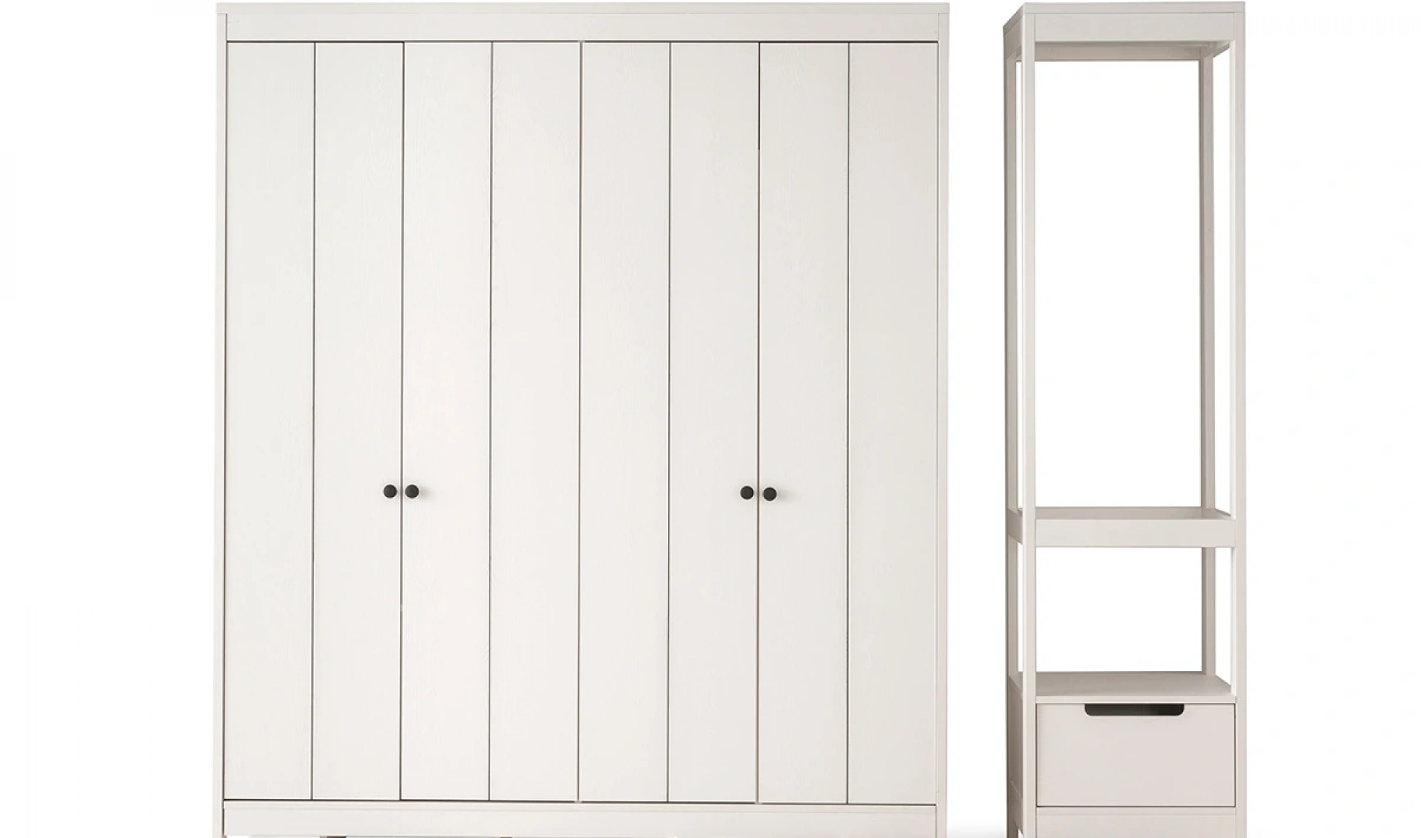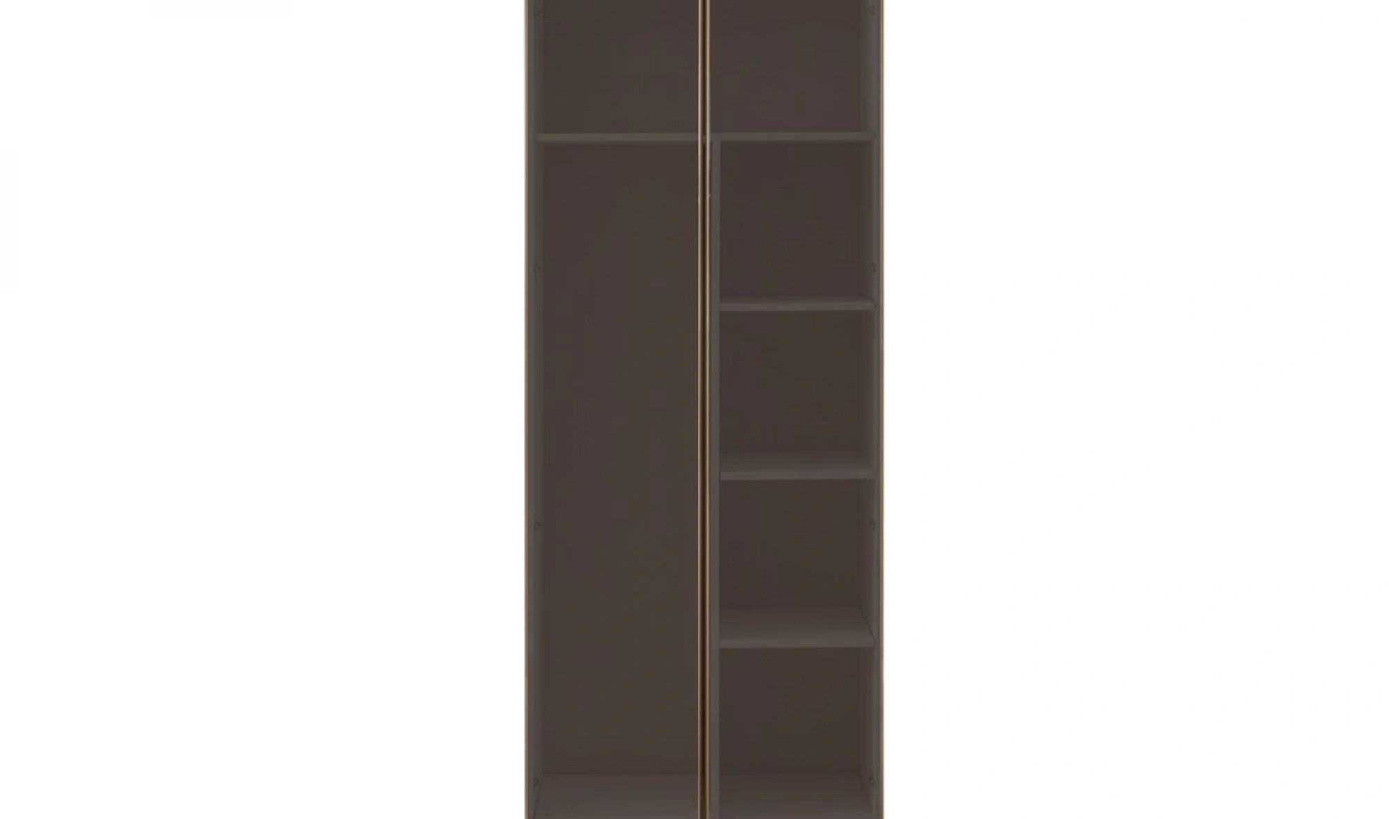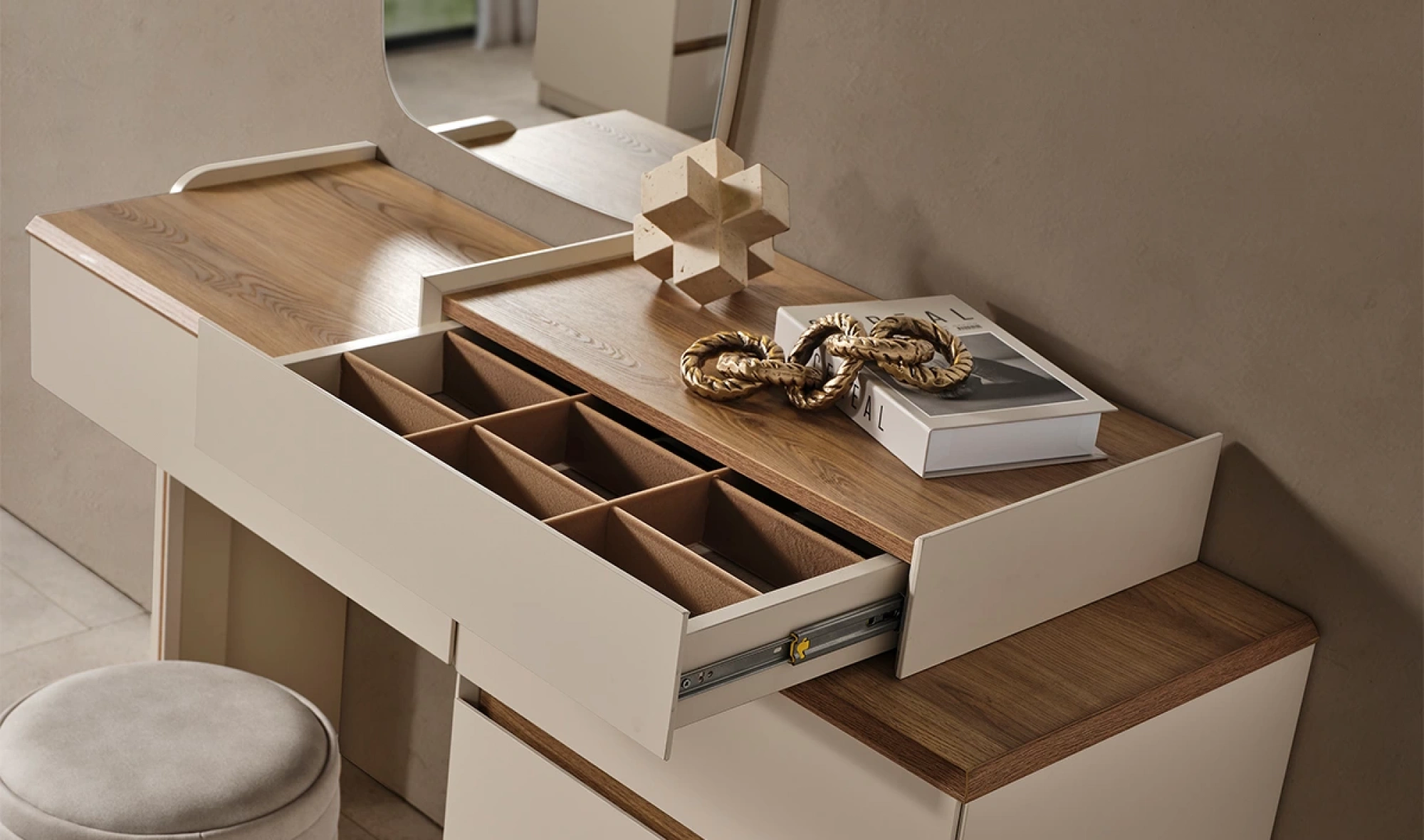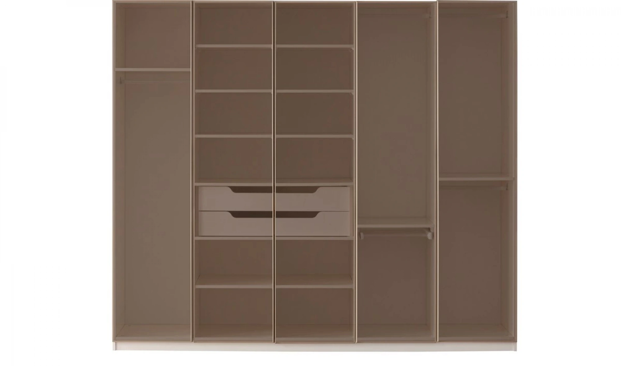 Modüler yapıya sahip dolap tasarımı, 1+4+1 kapak düzeni ile birlikte kullanıcıya özel kombinasyon imkanı sağlıyor. Geniş raf alanları, askılıklar ve çekmeceler; ceket, gömlek, elbise ve tüm kıyafet gruplarınızı kolayca yerleştirmenize olanak tanır. Özellikle köşe modül seçeneği ile giyinme odası olarak kullanılabilir nitelikte bir çözümdür.