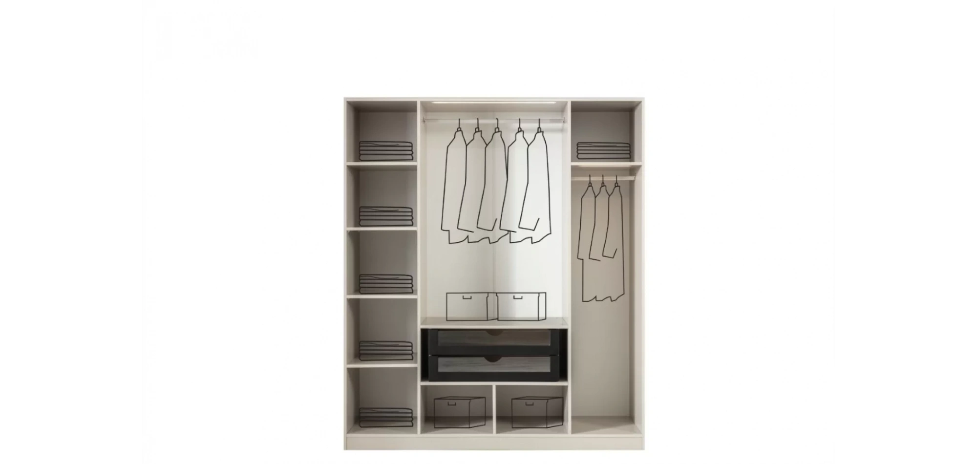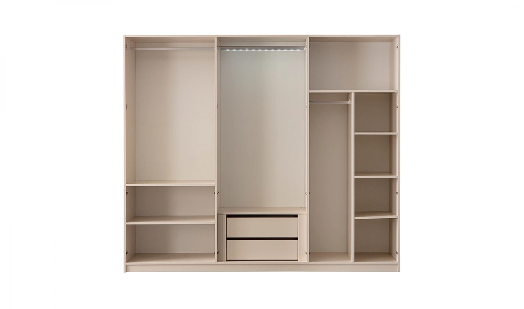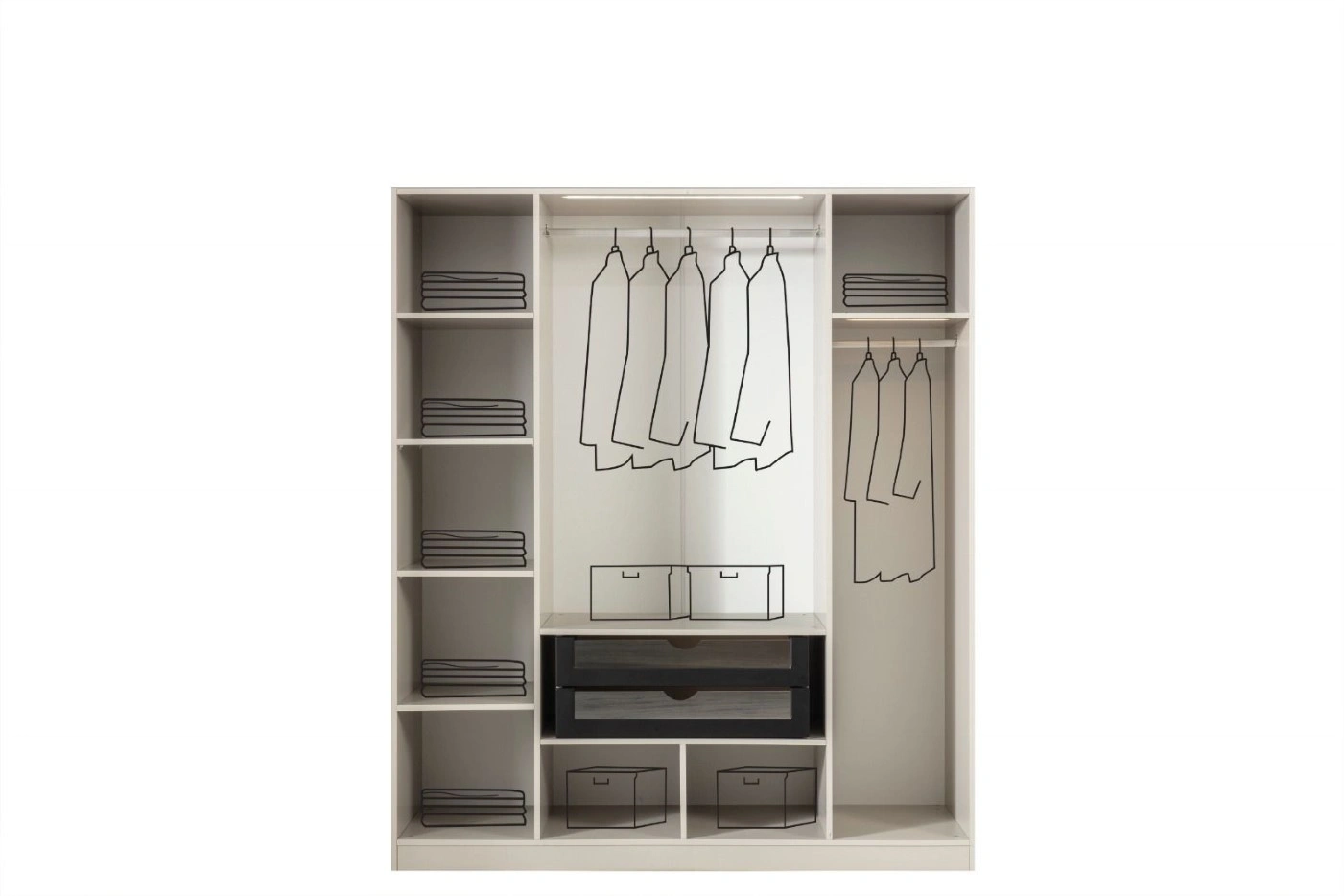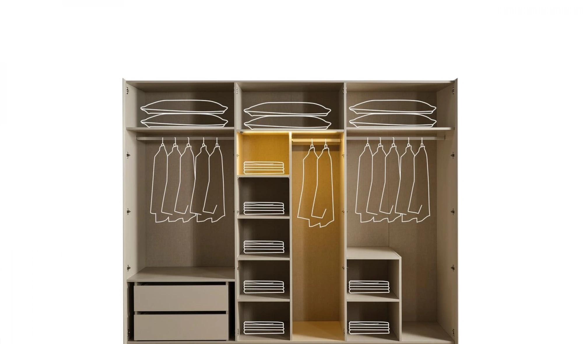 - Dolap: Geniş iç hacim – askı bölmeleri, raflar, çekmeceler
