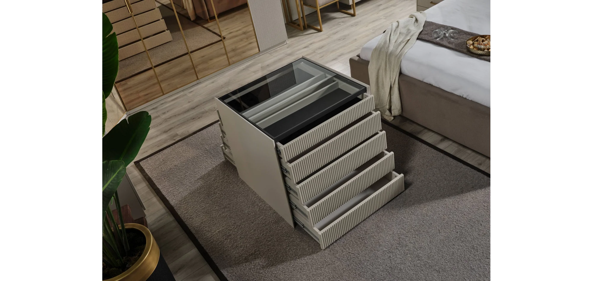 Lake boyalı CNC desenli MDF yüzeyler, reflekte gold cam kapaklı dolap, ve altın tonlu metal ayak-kulp detayları ile göz alıcı bir atmosfer sunar.