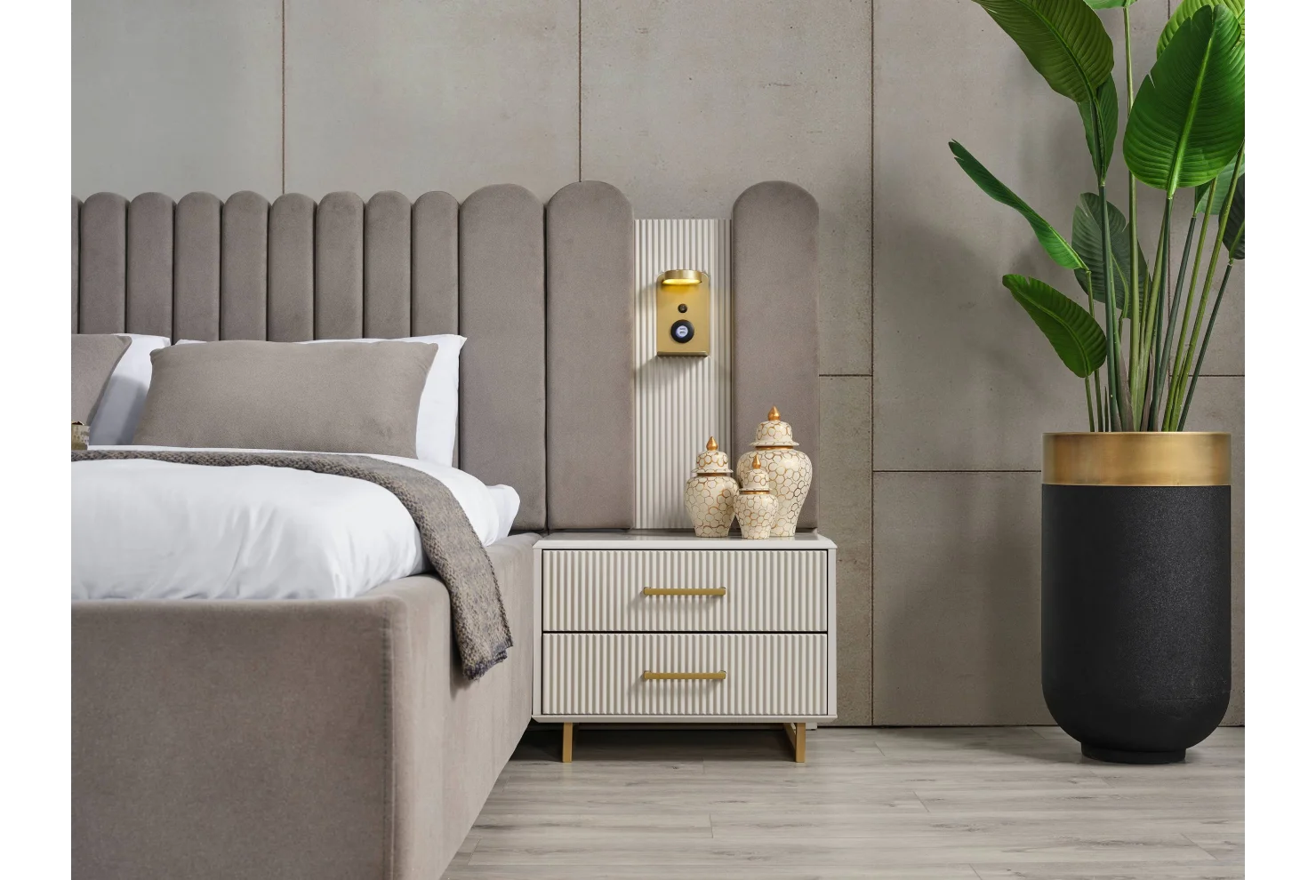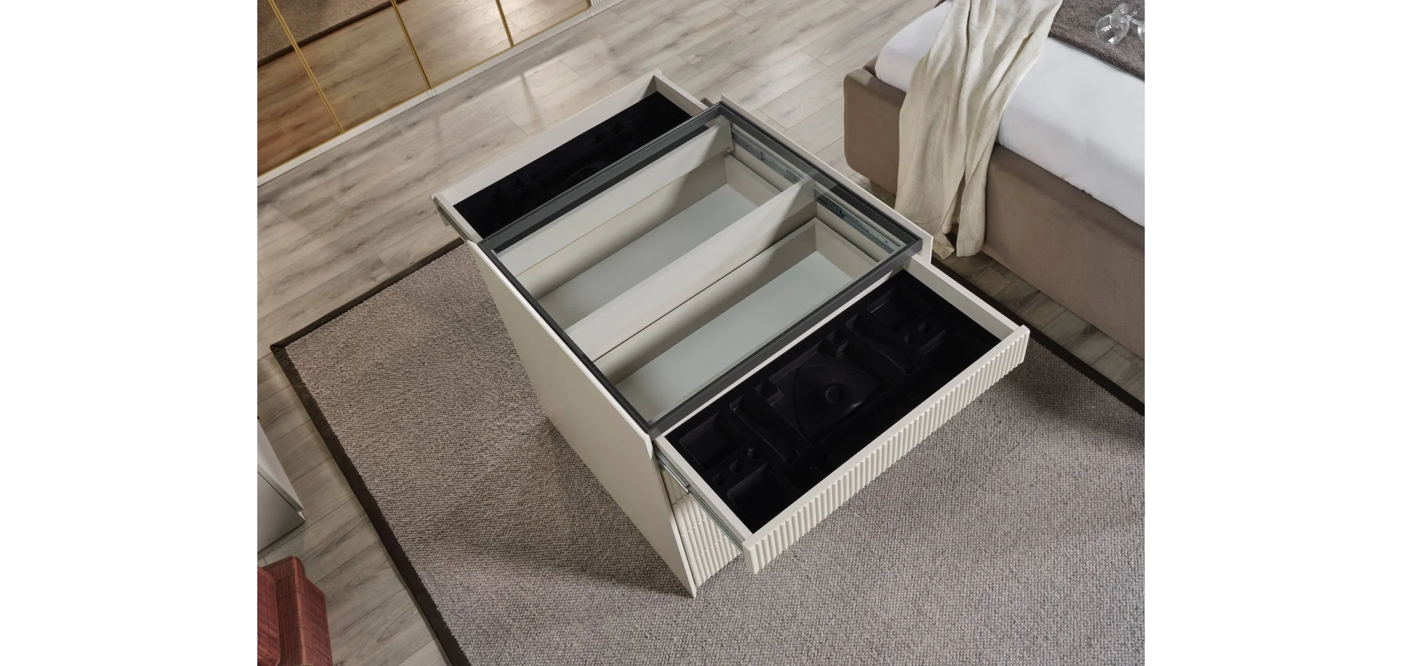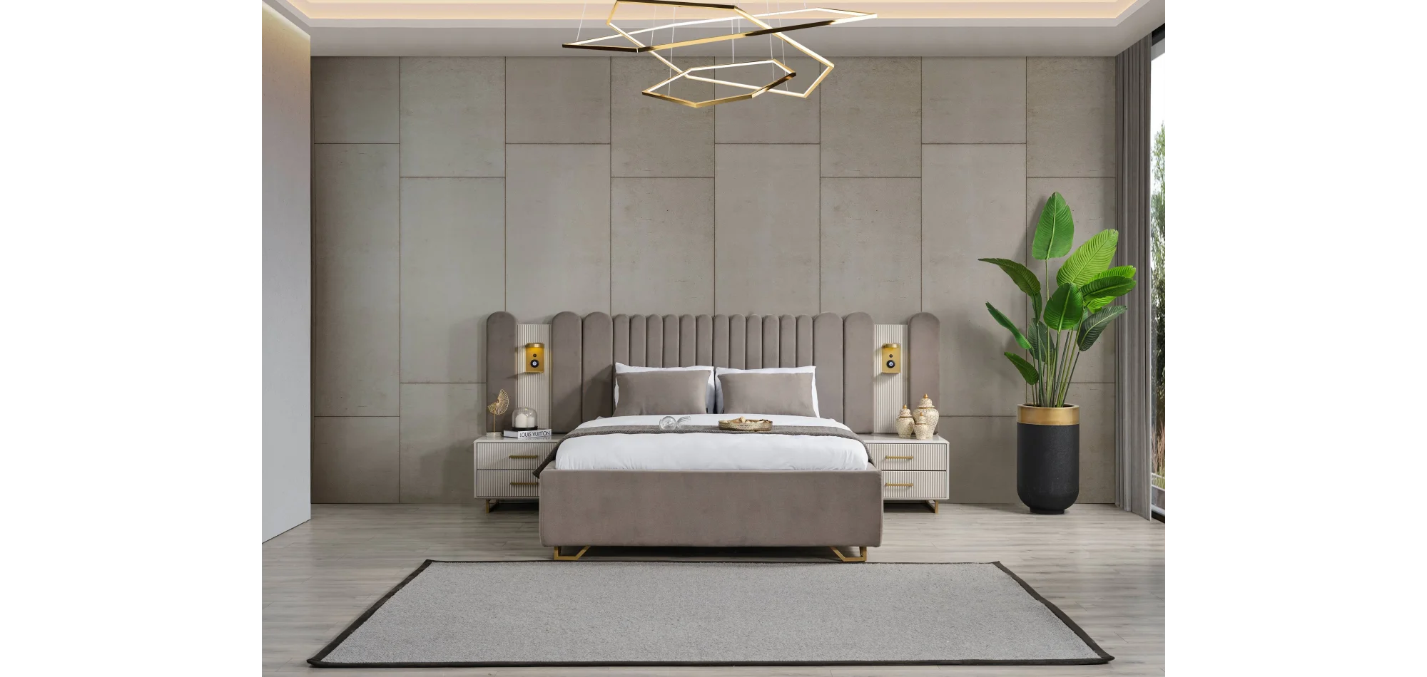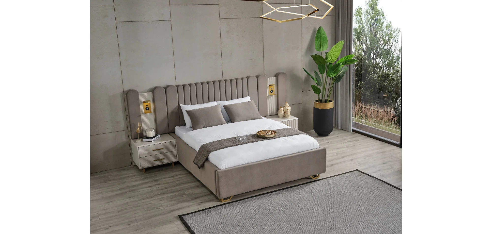 Modern tasarımı teknolojik donanımlarla birleştiren Obsidian Gold Yatak Odası Takımı, zarafeti ve işlevselliği bir araya getirerek yatak odanızı özel bir yaşam alanına dönüştürüyor.