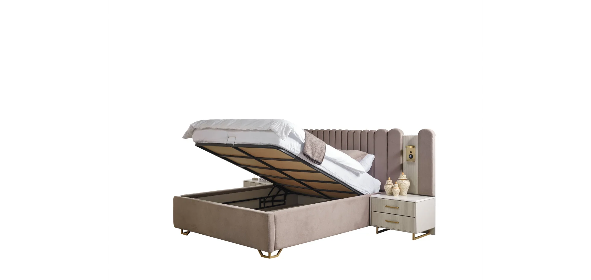 - Karyola: Bazalı, başlıkta telefon koyma alanı + USB şarj + kitap okuma lambası (oynar başlıklı)