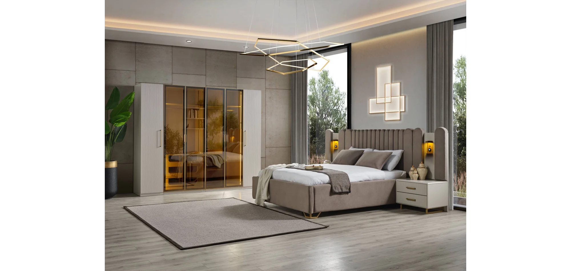 Tüm bu estetik detaylar, LED aydınlatmalı iç dolap ve ayna sistemiyle desteklenerek mekânda ferah ve sofistike bir etki yaratır.