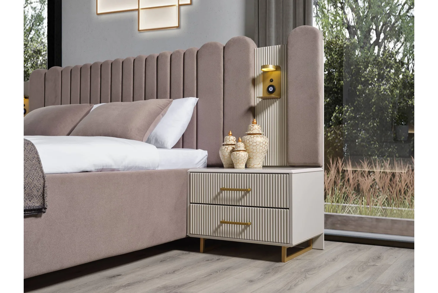 - Komodin: Çift çekmeceli, gold ayak ve kulp detayları