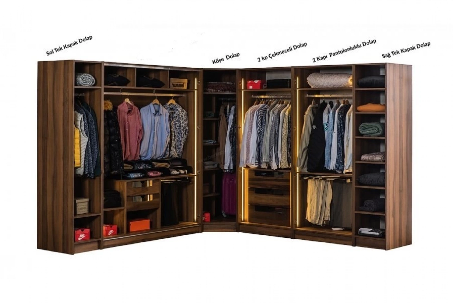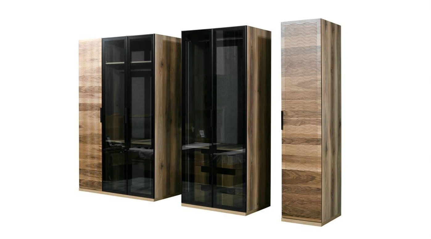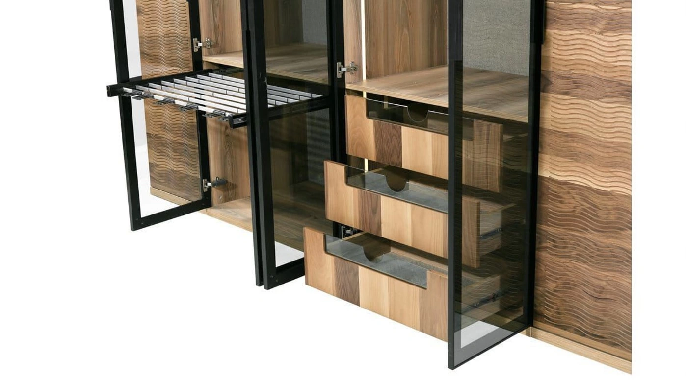 • 2 kapılı dolap, 1 kapılı dolap ve köşe modül dolabın birleşmesi ile bir giyinme odasından beklenen tüm ihtiyaçlara cevap verecek niteliktedir.