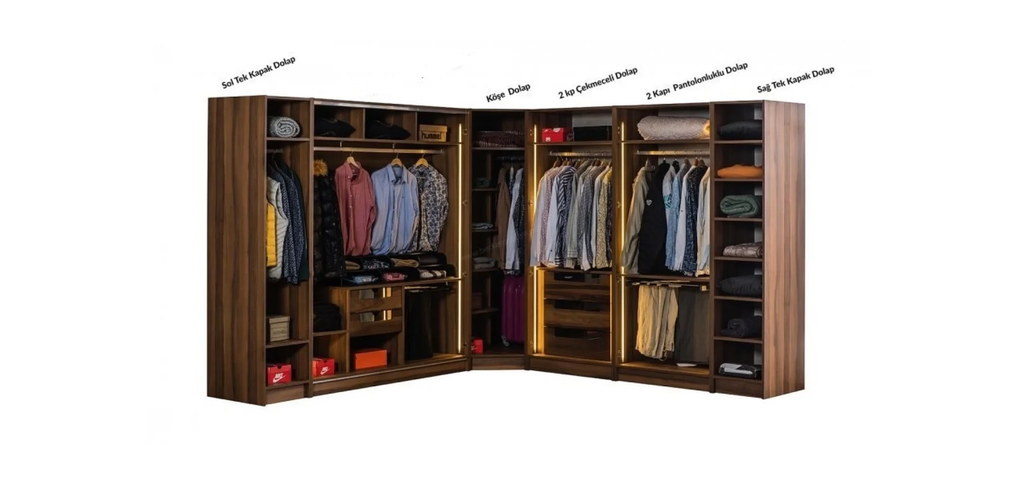 - Dolap Yapısı: Köşe modül, askılık alanları, raflar, çekmeceler