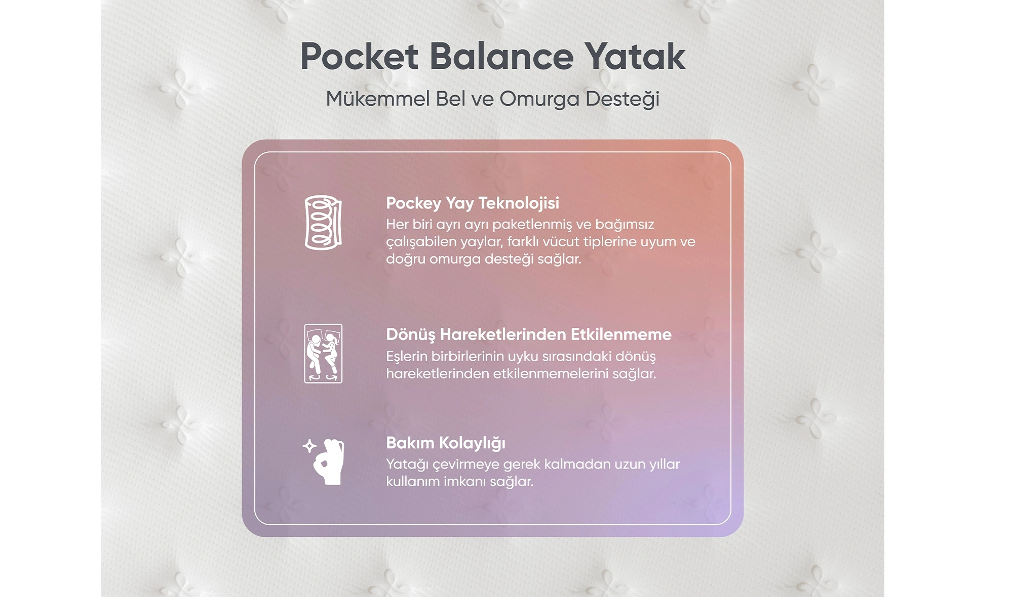 Birbirinden bağımsız çalışan özel pocket yay sistemi sayesinde eşlerin, uyku esnasında birbirlerinin dönüş hareketlerinden etkilenmesini önler.