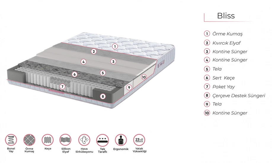 Yatak, uykunun kalitesini doğrudan etkileyen en önemli üründür. Relax Mobilya, farklı ihtiyaçlara uygun yatak modelleri sunarak uyku kalitenizi artırmayı hedefler. Geniş ürün yelpazemiz; lateks, yaylı ve visco yataklar gibi farklı kategorilerden oluşur. Yatak seçiminde dikkat edilmesi gereken en önemli unsurlar, vücut yapınıza uygun destek sunması, nefes alabilirlik ve omurga sağlığını koruyacak ergonomik yapıya sahip olmasıdır. Uykusuz geçen gecelere ve sabahları yaşanan sırt ağrılarına veda etmek için size en uygun yatak modelini tercih edebilirsiniz.
