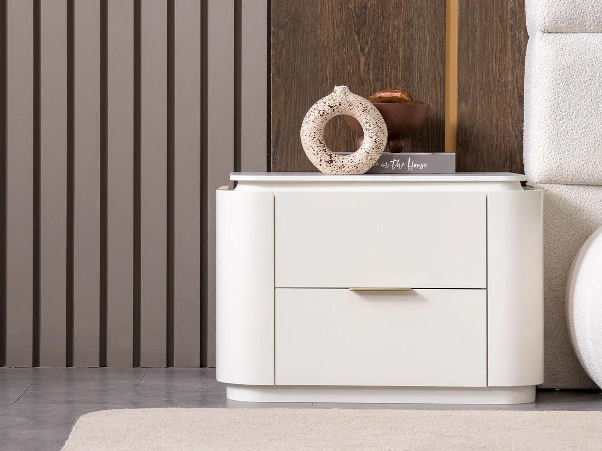 - Komodin: 2 çekmeceli – yere sıfır tasarım