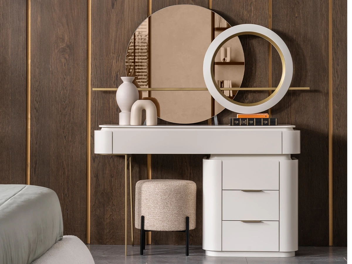 Şans Yatak Odası Takımı, modern tasarımı ve lake boyalı beyaz mermer desenli üst yüzeyleriyle dikkat çeken, estetik ve kullanışlı bir takımdır. Bakır renk metal kulp ve ayak detayları, tasarımı zenginleştirirken; ayna kapaklı dolaplar ve bazalı karyola ile hem fonksiyonel hem de şık bir kullanım sunar.