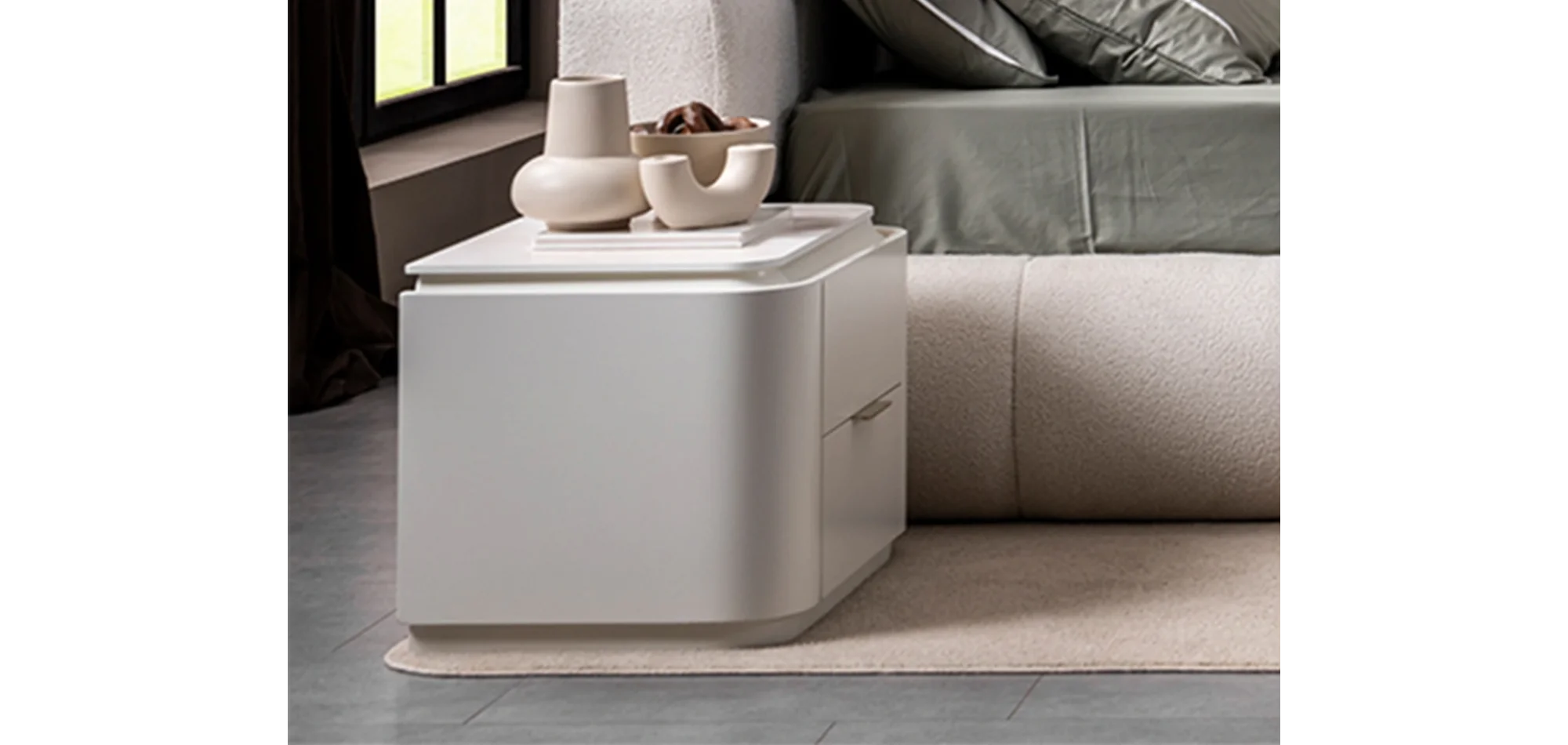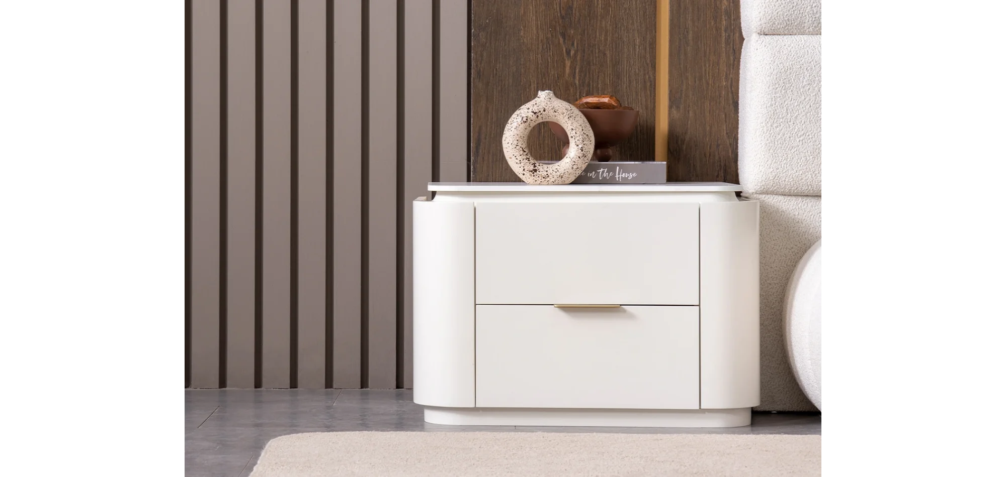 - Komodin: 2 çekmeceli – yere sıfır tasarım