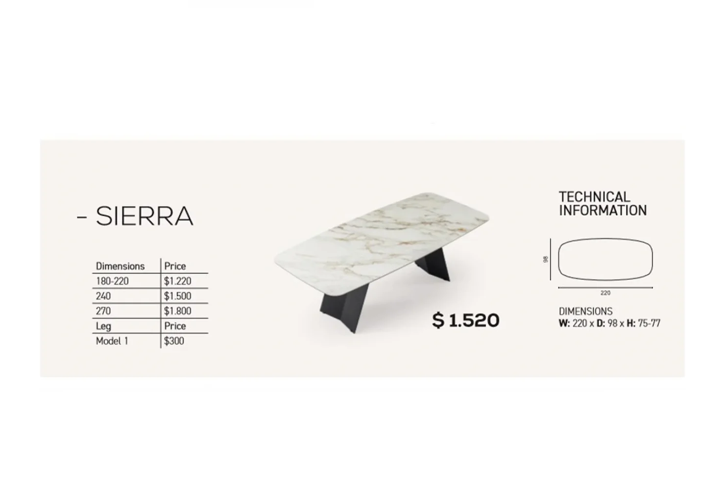 - Kesim Tipi: Sierra Modern, zarif hatlı özel masa kenar kesimi