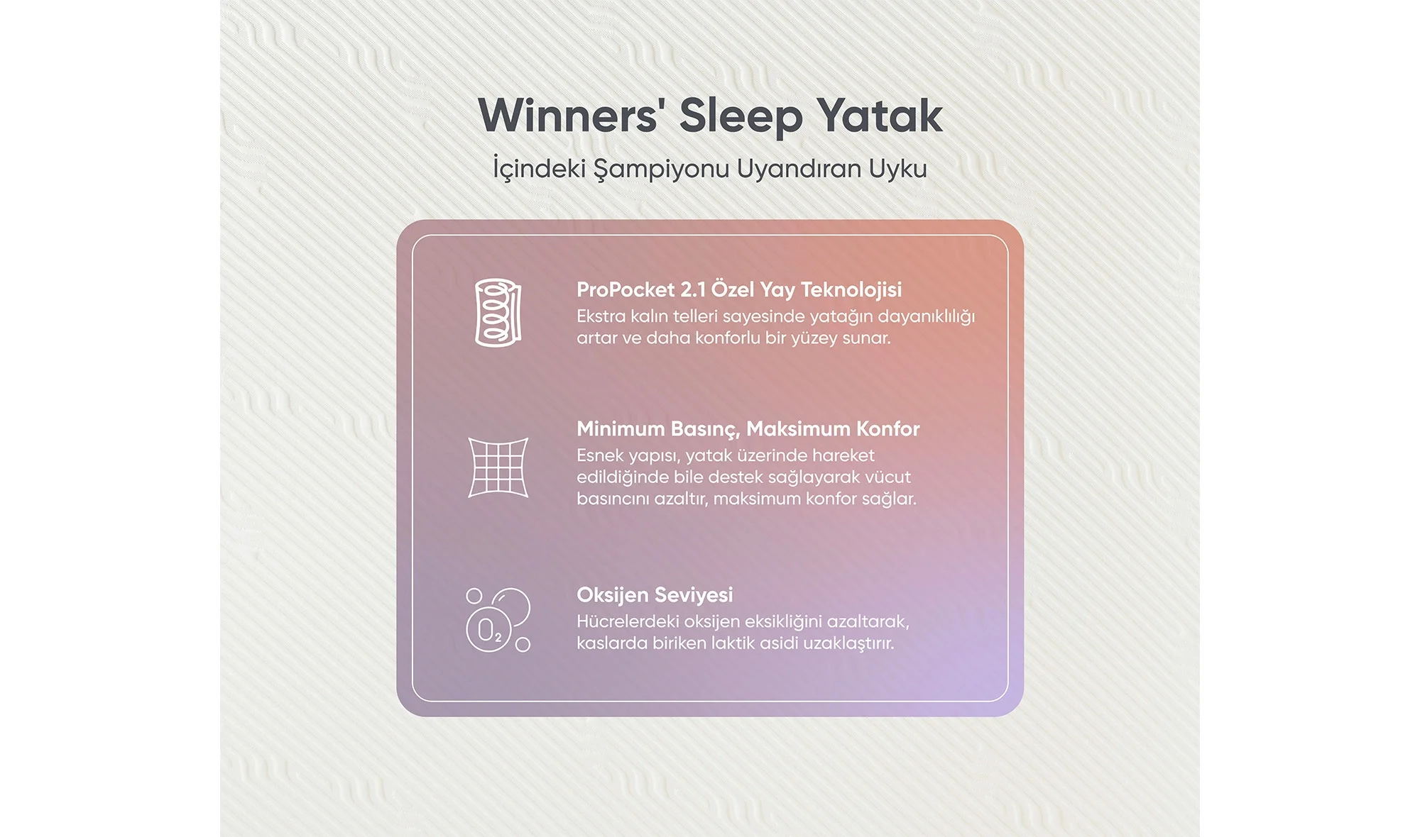 Sporcular için özel olarak tasarlanmış Winners’ Sleep yatak, sporcuların ihtiyaç duyduğu uyku koşullarını bir araya getirerek konforlu ve verimli bir uyku ortamı sunar.